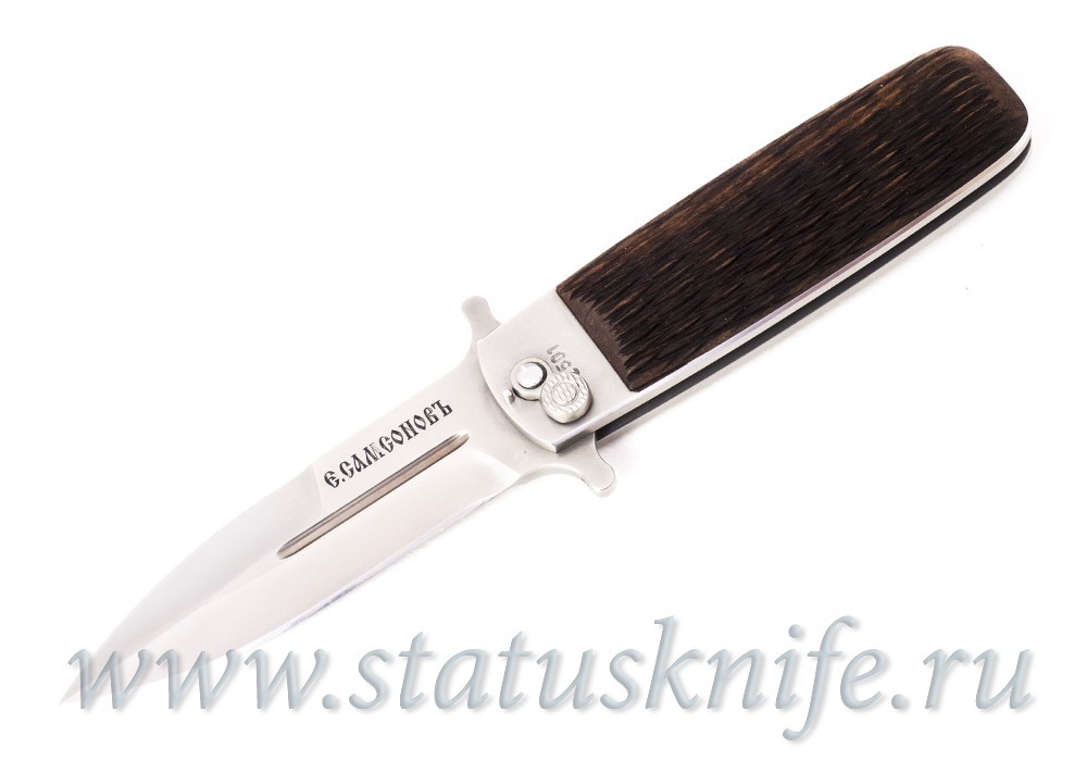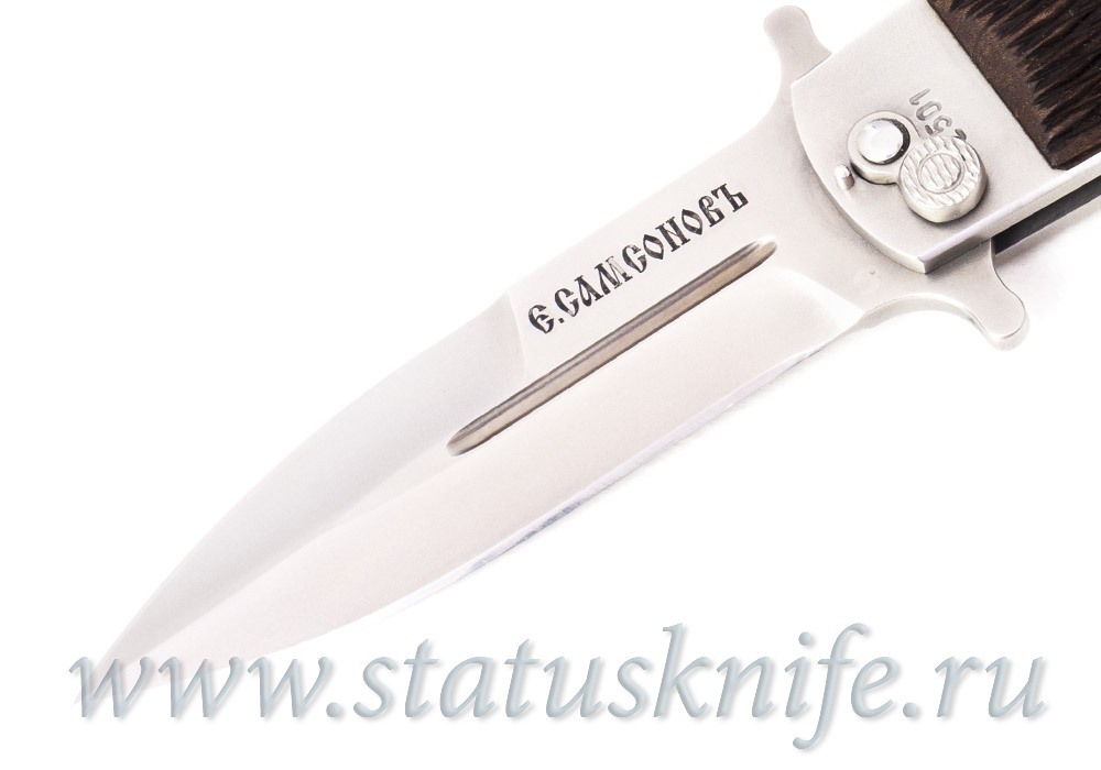 Длина клинка 90 мм, спуски с 2 сторон клинка (с фальшлезвием), общая длина 190 мм, фирменный затвор очень крепкий, надежный. Допуски минимальны. Рукоять стальная с накладками из дерева, рисунок на накладках выполнен мастером вручную.